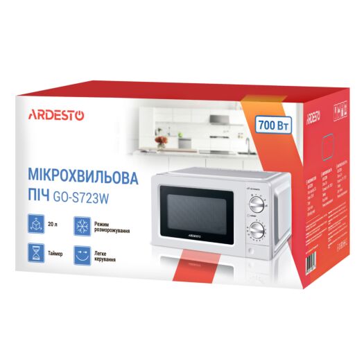 ARDESTO Мікрохвильова піч, 20л, мех.управл., 700Вт, відкр.кнопкою, білий
