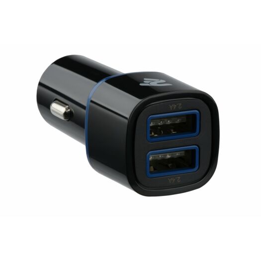 Універсальний автомобільний зарядний пристрій чорного кольору з двома портами USB та силою струму 2.4А на кожний рознім. Підходить для одночасної зарядки смартфона та планшета.