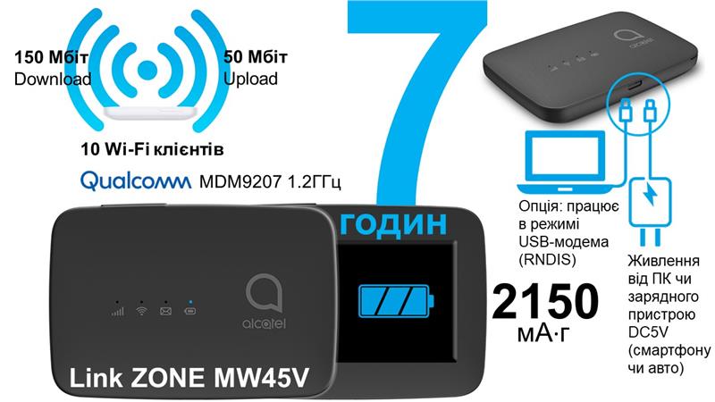 Компактний кишеньковий 4G LTE Wi-Fi-роутер Alcatel LINKZONE (MW45V), який має різноманітні сценарії використання і забезпечить надійне з’єднання зі швидкісним мобільним інтернетом для 10 Wi-Fi-пристроїв.