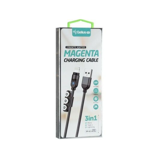 Магнітний кабель Gelius Pro Magenta 3 в 1 - універсальне рішення для підзарядки ваших гаджетів. Кабель наділений тримачем, в якому зберігаються коннектори різного типу: