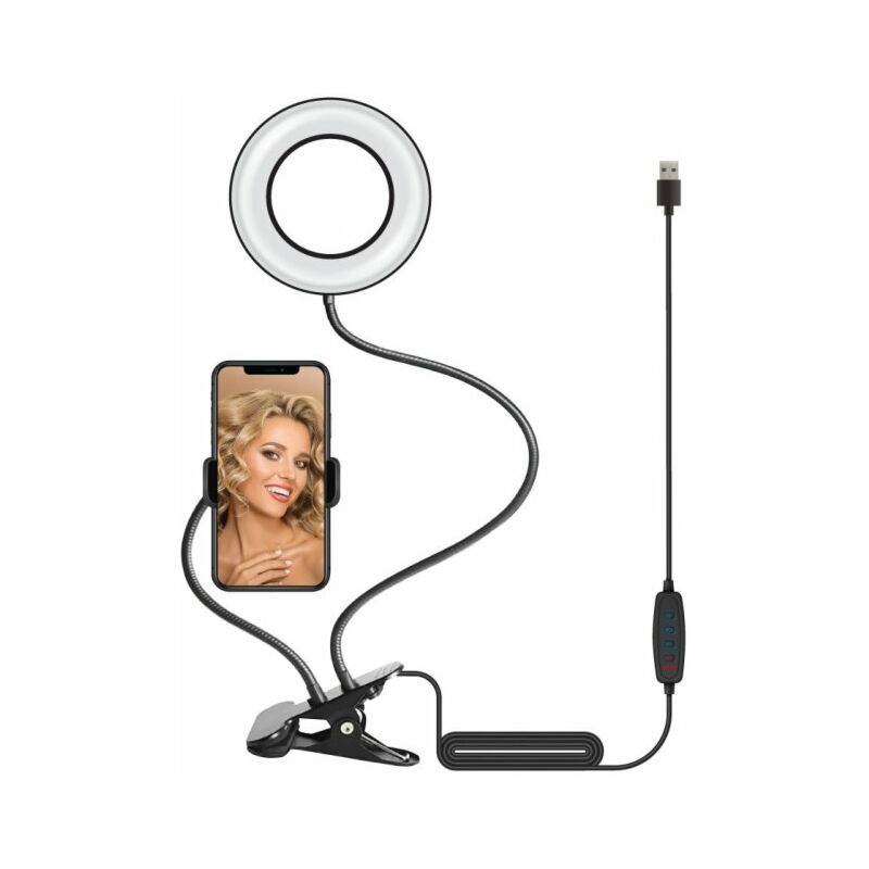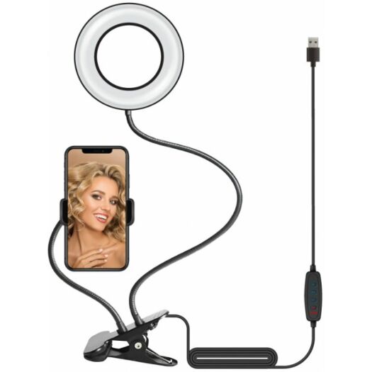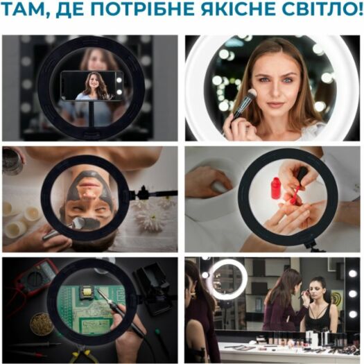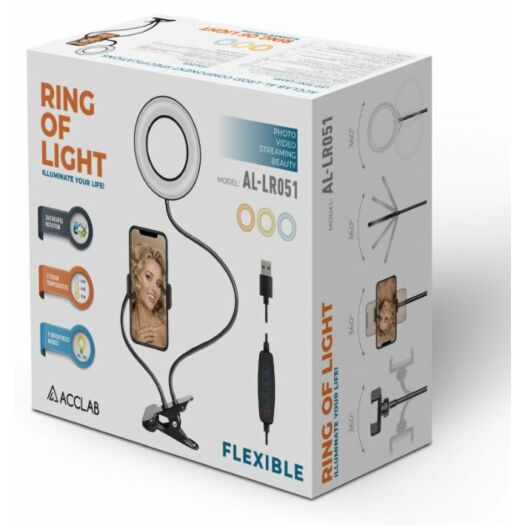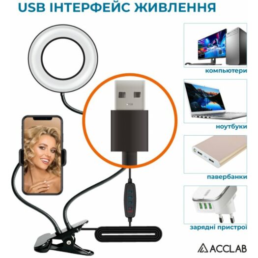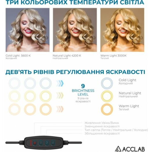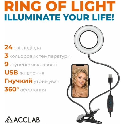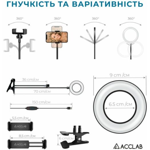 Лампа блогера ACCLAB AL-LR051 Набір для блогера від ACCLAB AL-LR051 знадобиться блогеру, ютуберу та всім, хто пов'язаний із відео- та фототворчістю. 9 ступенів яскравості дають змогу робити фото за будь-якого освітлення. Вночі на вечірці, у темному приміщенні — будь-де! Три типи світла (холодне, нейтральне й тепле) дадуть змогу урізноманітнити ваші фото та відео. Зручне кріплення у формі прищіпки й гнучкі штативи дають змогу налаштувати положення лампи або тримача для смартфона в будь-якому зручному положенні. Кільцева лампа зручна в експлуатації завдяки гнучкій конструкції штативів.