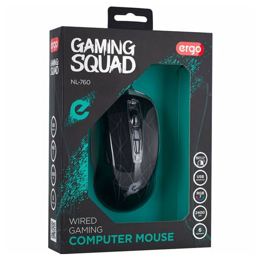 Мишка ERGO NL-760 укомплектована чутливим сенсором і 5 клавішами: перемикачем DPI (1000/1600 / 3200-6400) і прогумованим колесом прокрутки. Cемикольорове RGB-підсвічування, яким оснащений маніпулятор, не тільки робить техніку ефектним елементом інтер'єру; така функція дає можливість комфортно працювати навіть ввечері або вночі.