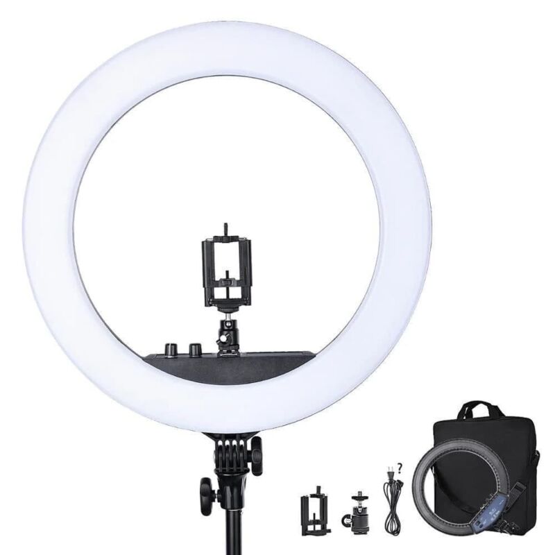 Кільцева світлодіодна лампа HQ-18 Ring Light - має велику кількість світлодіодів з двома диммерами для регулювання кольору. Ця лампа підійде для фахівців в області краси та фотографів, на лампі є кріплення для смартфонів і фотоапаратів. Лампа HQ-18 досить стійка, повернути лампу ви можете на 180 градусів. Завдяки плавного регулювання яскравості ви зможете підібрати для себе потрібний колір світіння (теплий, нейтральний, холодний). Кільцева лампа HQ-18 буде незамінна для: власників салону краси, візажистів, фотографів, майстрів манікюру, майстрів бровістов, фахівців з нарощування вій, косметологів, ювелірів, а також для предметної зйомки.