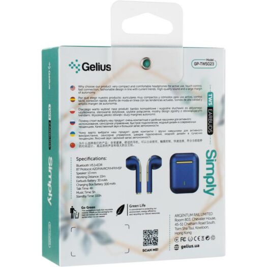 Нова гарнітура від Gelius виконана з урахуванням потреб меломанів. Завдяки правильній фактурі вкладиша, після декількох годин прослуховування музики ви не відчуєте дискомфорт, Твінси повністю повторюють форму вушної раковини. 5 годин безперервного задоволення: у Вашому розпорядженні батарея в 30 мАг в кожному навушнику, а так само зарядний кейс ємністю 250 мАг.