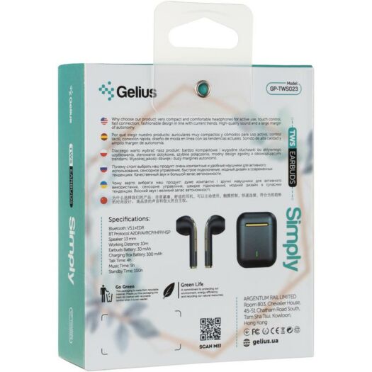Нова гарнітура від Gelius виконана з урахуванням потреб меломанів. Завдяки правильній фактурі вкладиша, після декількох годин прослуховування музики ви не відчуєте дискомфорт, Твінси повністю повторюють форму вушної раковини. 5 годин безперервного задоволення: у Вашому розпорядженні батарея в 30 мАг в кожному навушнику, а так само зарядний кейс ємністю 250 мАг.
