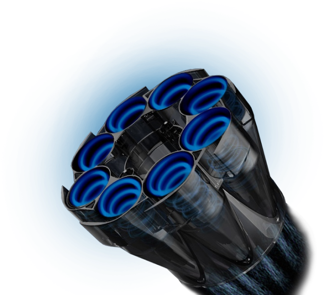 Пилосос оснащений багатоконусною циклонічною конструкцією: мініатюрні конусні ячейки створюють «ефект торнадо», збільшуючи тим самим всмоктувальну здатність і забезпечуючи відділення пилу і бруду від повітря. Все сміття направляється до пилозбірника і осідає на його стінках, не маючи шансів вдруге потрапити в приміщення.