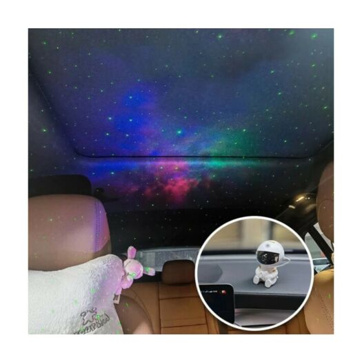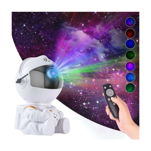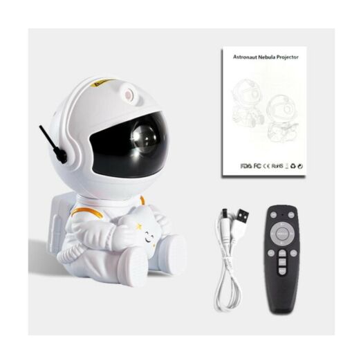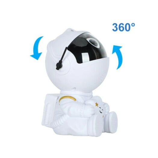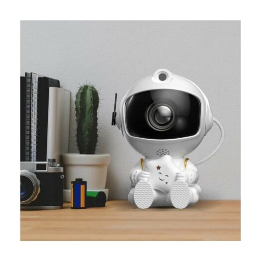 Лазерний проектор галактики у вигляді астронавта, що тримає в руках зірку, стане чудовим нічником та улюбленою іграшкою для дітей. Вісім яскравих різнокольорових зображень космосу дозволять перенести розкіш зоряного неба на стіну, стелю кімнати чи машини. Ви можете налаштувати кут проекції, оскільки проектор знаходиться в рухомому шоломі астронавта. Голова космонавта обертається на 360°, з магнітним тяжінням, отже зоряне небо може бути проектовано будь-де без обмежень. Для максимальної зручності користувачів є 2 способи керування: кнопка на корпусі проектора та пульт дистанційного керування. Кнопка на задній панелі може включати та вимикати пристрій та перемикати між режимами проекцій. Пульт дистанційного керування може також керувати пристроєм та регулювати колір, яскравість та частоту миготіння зірок та швидкість обертання галактичних туманностей. Проекції зірок та туманностей можна використовувати одночасно чи окремо.