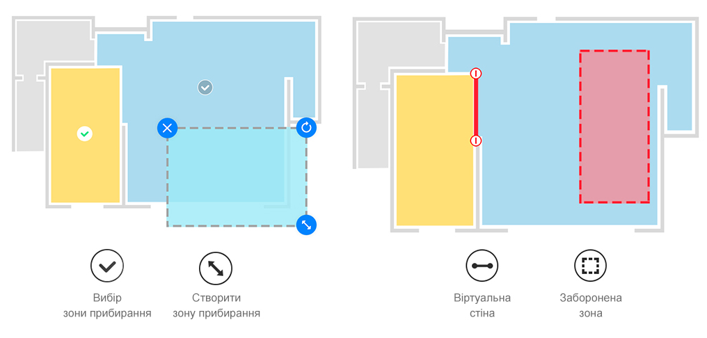 | Функції та режими | Режими роботи: автоматичний, локальний Побудова карти приміщення Віртуальна стіна Розрахунок часу прибирання Прибирання за розкладом Автоматичне повернення на зарядний пристрій Визначення ступеня забруднення Програмування по днях тижня Захист від падіння зі сходів |