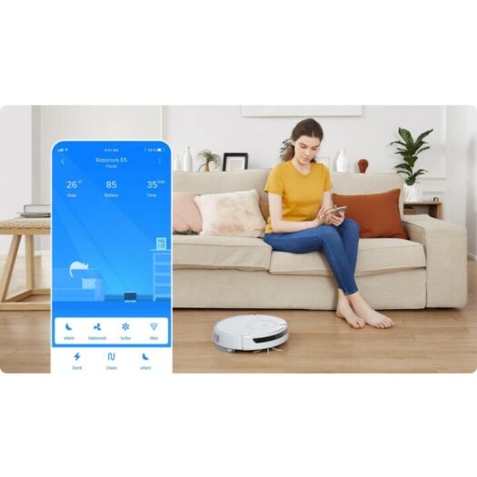 Робот-пилосос RoboRock E5 подвійної дії з датчиком OpticEye, парою гіроскопів та інтелектуальними алгоритмами побудови карт чудово виконує свої завдання, ефективно очищуючи площі великих житлових приміщень. Всмоктувальна технологія HyperForce спільно з акумулятором збільшеного обсягу здійснює прибирання, результат якого порадує навіть найприскіпливішого поціновувача чистоти. Додатковий комфорт взаємодії забезпечує пульт MagBase, що керує технікою на дистанції.