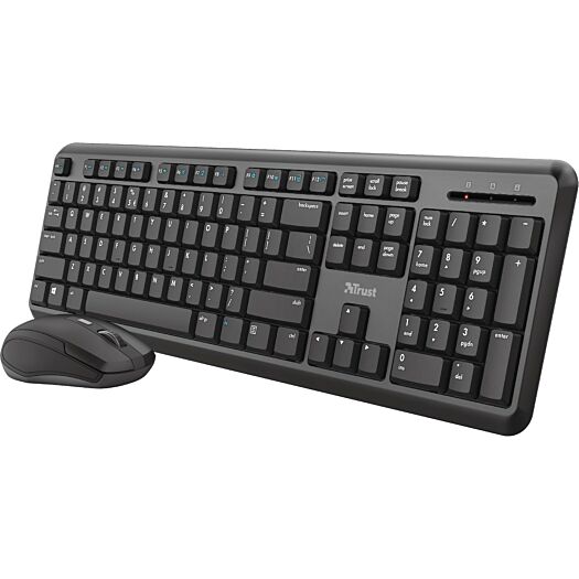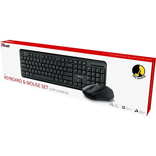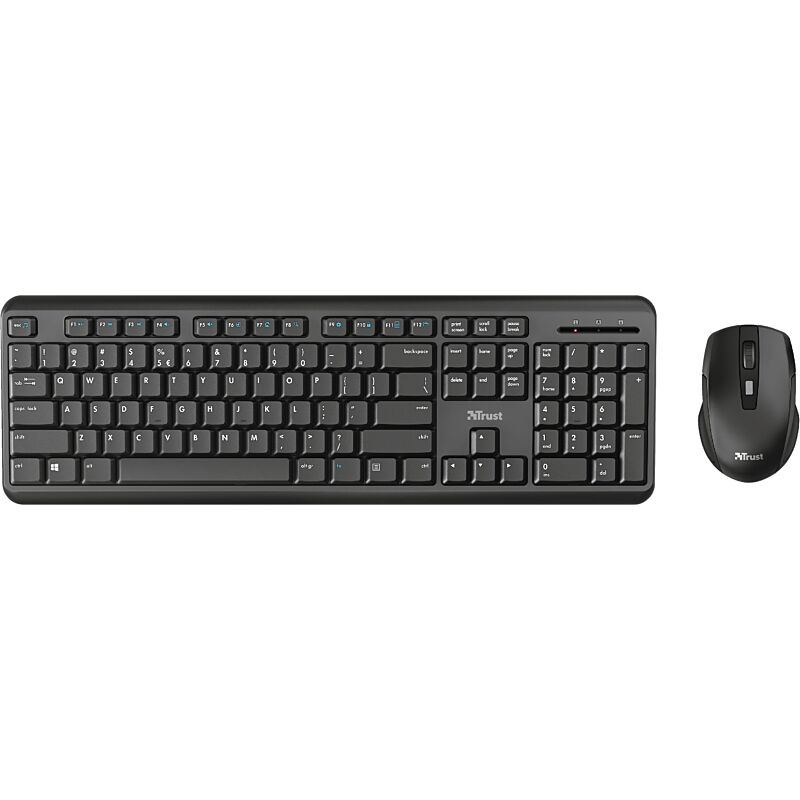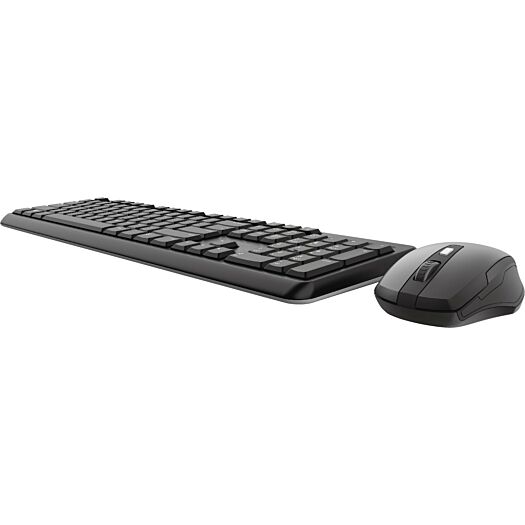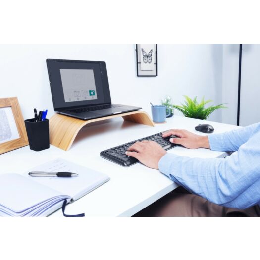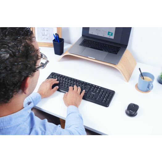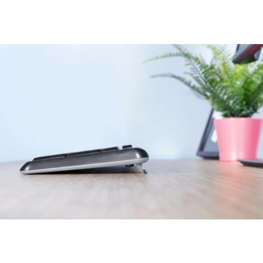 Бездротові безшумні клавіатура та миша для тривалої комфортної роботи. Повноформатна клавіатура з низькими клавішами забезпечує м'якість та зручність натискання. Для підключення обох пристроїв використовується один USB-приймач, який можна зберігати всередині миші.
