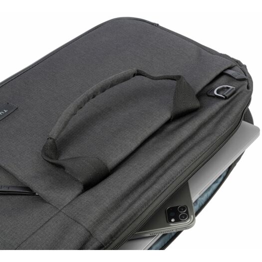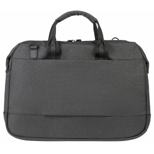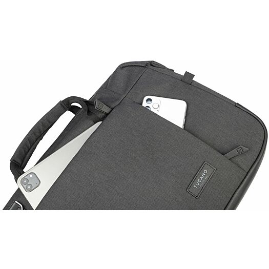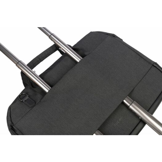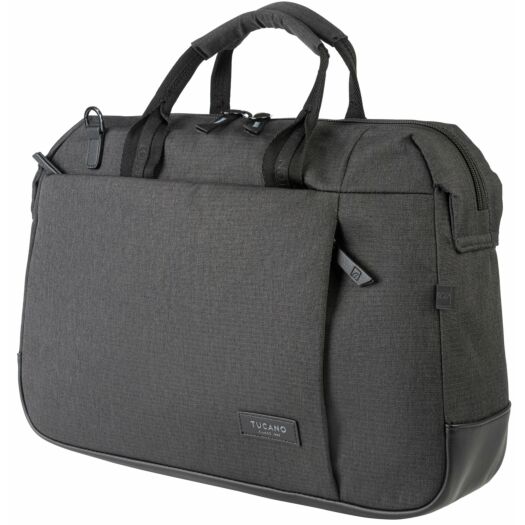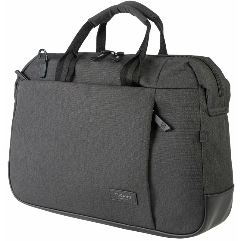 Містка сумка Tucano AGO 15 для ноутбуків 15,6" і MacBook 16" з меланжевої тканини, виробленої з переробленого пластику. Легка сумка Ago має прямокутну форму, і складається з головного відділення і двох невеликих кишень. З тильного боку сумки передбачене кріплення, за допомогою якого сумку можна прикріпити до телескопічної ручки валізи. Плечовий ремінь регулюється і знімається. Нижні кути сумки додатково оброблені накладками з еко шкіри, що додає естетичності і створює додатковий захист для кутів сумки і вмісту.