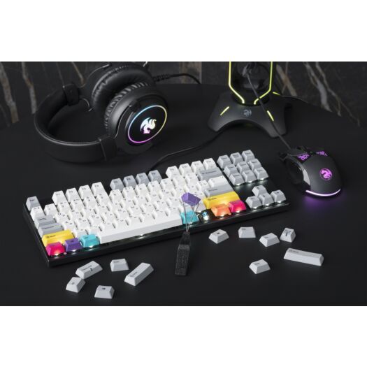 Компактна клавіатура Varmilo VA87M V2 CMYK має оригінальний дизайн. Ковпачки виготовлені з високоміцного пластика PBT із застосуванням dye-sublimation технології з вигравіруваними символами на боках, використання dye-sub дозволяє символам ніколи не стертися і ніяк не відчуватися при натисканні, а якісний PBT пластик гарантує надійність і довговічність, клавіші мають злегка текстурований верх і приємні на дотик.