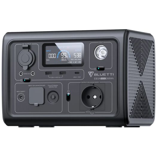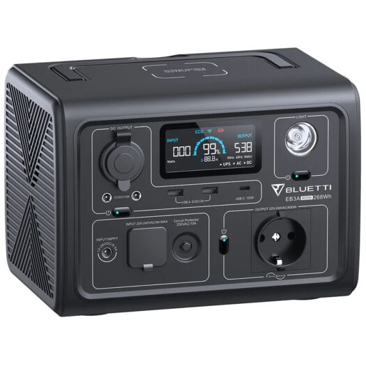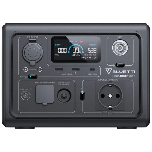 Bluetti EB3A – надійна та функціональна зарядна станція, оснащена акумулятором на 268 Вт·г та великим набором виходів. З нею ви зможете підживлювати домашню техніку у випадках відключення електрики, а також комфортно використовувати гаджети під час риболовлі та походів. Для зручності користувачів пристрій оснащений інформативним дисплеєм та ліхтариком, а невелика вага та відкидна ручка максимально спрощують його перенесення.