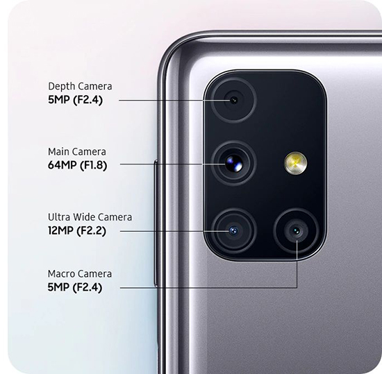 Samsung Galaxy M31s здатний точно перенести всі деталі, емоції і навіть настрій на фотографію, отримуючи яскраві та насичені знімки при будь-яких умовах зйомки. Основний модуль 64 Мп отримує чіткі знімки навіть при недостатньому освітленні. Ширококутна камера на 12 Мп створює виразні атмосферні знімки з охопленням на 123 градуси. Макрокамера 5 Мп якісно передає найдрібніші деталі фото, камера глибини 5 Мп відповідає за художнє розмиття фону.