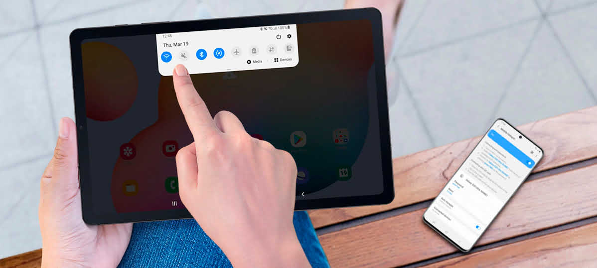 Синхронізуйте свій Samsung Tab S6 lite зі смартфоном Galaxy, щоб не пропустити вхідний дзвінок або відреагувати на важливе повідомлення прямо з екрану планшета, навіть коли смартфона немає під рукою.