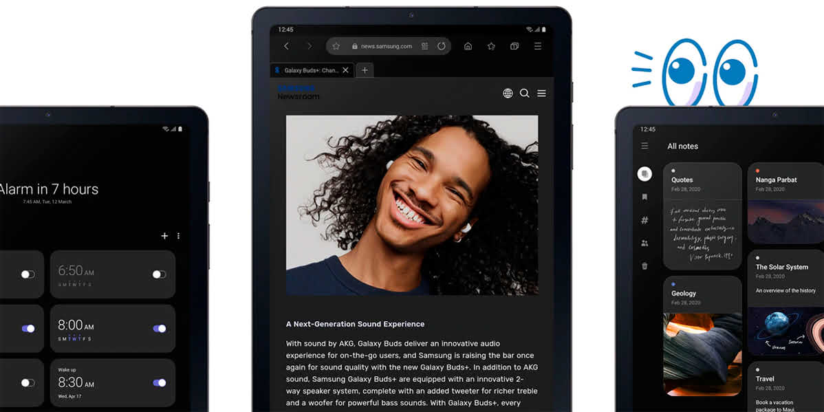 Щоб зменшити навантаження на зір при тривалому використанні Samsung Tab S6 lite, встановіть темний режим інтерфейсу One UI 2. Крім того, що темний режим знижує стомлюваність очей, він ще й дозволяє економити ресурс батареї.