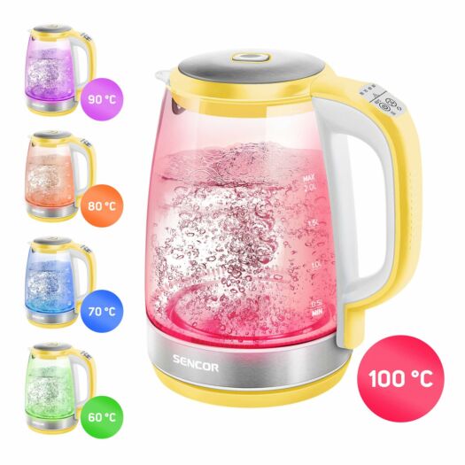 Електрочайник Sencor SWK2196YL підтримує температуру протягом 30 хвилин, оснащений фільтром бруду і вапняного нальоту, світлодіодним підсвічуванням і потрійною системою безпеки.