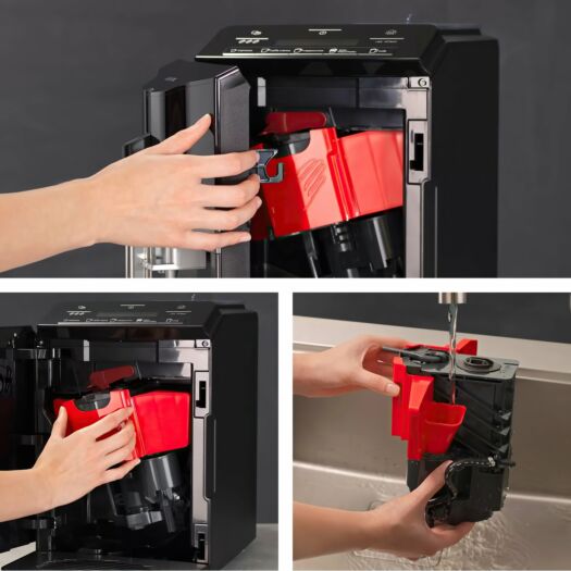 Високоякісний керамічний млинок ceramDrive. Неперевершено делікатний помел: керамічний млинок ceramDrive. Преміум-млинок з низьким рівнем шуму з високоякісної кераміки, який має здатність герметизувати ароматичні речовини. І оскільки кераміка, напротивагу сталевим млинкам, майже не зношується, можна гарантовано довше насолоджуватиметесь високою якістю смаку еспресо. Система oneTouch: приготування напоїв простим натисканням кнопки.