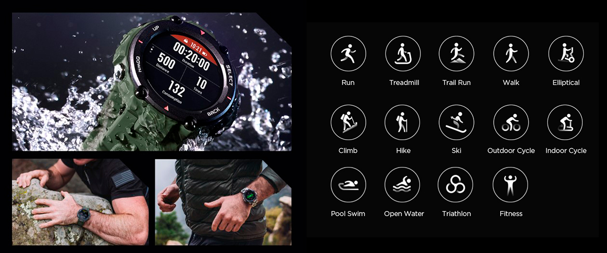 Amazfit T-Rex підтримує 14 вбудованих спортивних режимів. З їх допомогою ви зможете легко стежити за своїм прогресом під час тренувань і отримувати інформацію про пройдену відстань, швидкість, витрачені калорії, стежити за частотою серцевих скорочень. Водозахист 5 АТМ дозволяє не знімати годинник під час тренувань в басейні.
