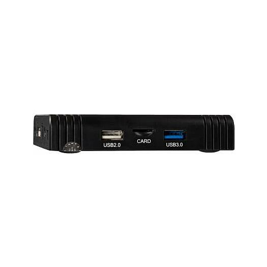 На дні розташовані 4 гумові ніжки. На фронтальній грані знаходиться екран, що відображає час. На лівій грані розташовані порт USB 2.0, слот для карти MicroSD і порт USB 3.0.
