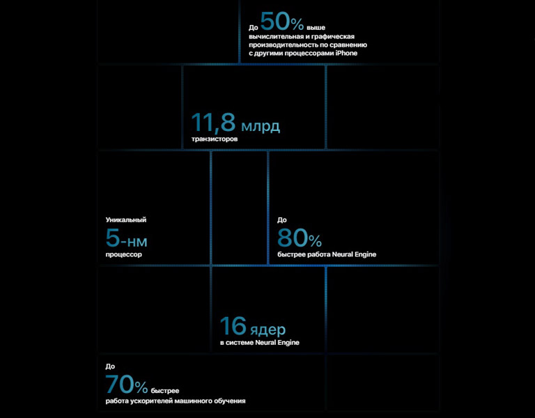 Унікальний процесор A14 Bionic, створений за 5-нанометровою технологією, працює ще швидше і споживає ще менше енергії. Його обчислювальна і графічна продуктивність зросли на 50 % в порівнянні з попередніми процесорами iPhone. Впровадження нового процесора обробки сигналу дозволяє знімати відео Dolby Vision, що можуть не всі професійні камери і не може жоден зі смартфонів.