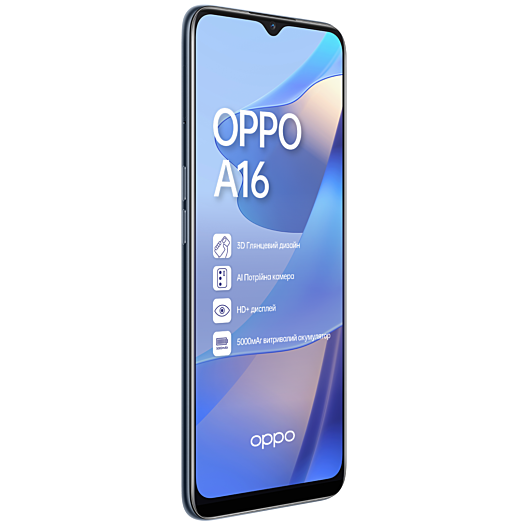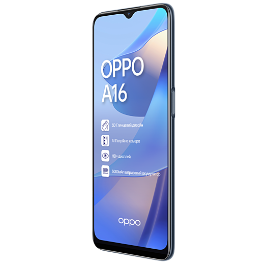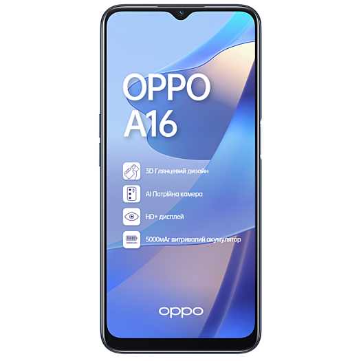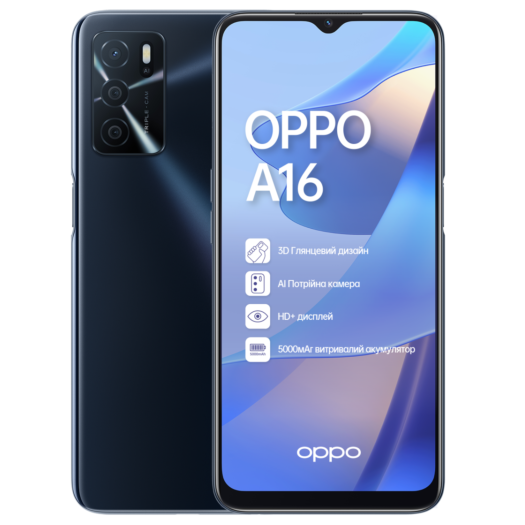 OPPO А16 з інтелектуальною системою з 3 камер та великим вибором фільтрів та режимів знімає приголомшливі фото. Батарея на 5000 мАг забезпечує зарядом на цілий день і дарує почуття свободи у будь-якій ситуації. Великий HD+ дисплей із технологією захисту зору забезпечує приголомшливі враження від перегляду.