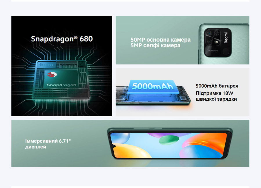 Смартфон Xiaomi Redmi 10C став ідеальним рішенням для тих, хто цінує швидкість виконання команд, любить робити якісні фото, має потребу довго бути на зв'язку без можливості зарядити телефон. Процесор Snapdragon® 680 вигідно відрізняє модель на тлі подібних у своєму ціновому сегменті. Камера з роздільною здатністю 50 Мп, акумулятор об'ємом 5000 мАг, іммерсивний дисплей 6.71” – всі ці інструменти допоможуть швидко вирішувати робочі завдання, ефективно навчатися, проводити дозвілля з користю.