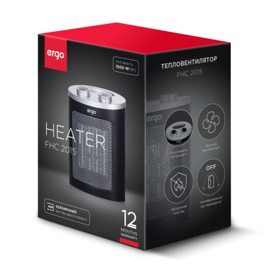 ERGO FHC 2015 S і ERGO FHC 2015 - компактні переносні тепловентилятори привабливого дизайну з керамічним нагрівальним елементом. Вони призначені для обігріву невеликих побутових приміщень - офісів, гаражів, кіосків. Прилади безпечні в експлуатації: у конструкції немає відкритої розпеченої спіралі, корпус виготовлений з міцного негорючого пластику, встановлений захист від перекидання.