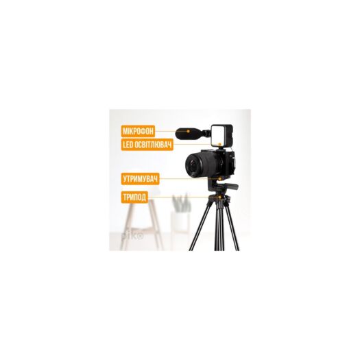 Комплект блогера Piko Vlogging Kit PVK-05LM, що складається з 50" підлогового трипода з тримачем для смартфона. У комплекті суперкардіоїдний конденсаторний спрямований мікрофон, який живиться від АА-батарейок. Чутливість 20 дБ. LED-підсвітка білого світла (36 точок LED, 650K, >600Lux). Живлення від АА-батарейок. Кнопка дистанційного керування смартфоном Bluetooth.