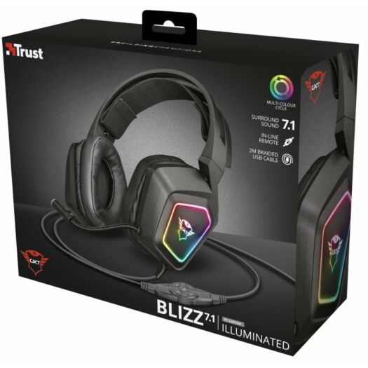 Зручна ігрова гарнітура з накладними навушниками, підсвічуванням типу RGB і об'ємним звуком 7.1 Trust GXT450 BLIZZ 71 RGB USB Black.