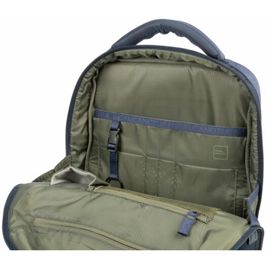 Рюкзак Tucano Astra 13 з нової колекції від Tucano. Сучасний дизайнерський рюкзак для ноутбуків з діагоналлю 13,3/14 дюймів з щільної тканини саржевого плетіння (Twill), виробленої з переробленого пластику, з обробкою у вигляді стрічки з малюнком лого Tucano. Компактний і зручний рюкзак Astra 13 має ідеальну організацію кишень і велике внутрішнє відділення. На передній стороні є дві місткі і зручні передні кишені, а на задній стороні - потайна кишеня і практичний ремінець для кріплення на телескопічній ручці чемодана.