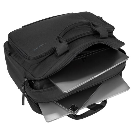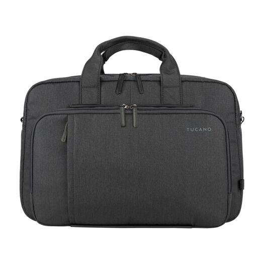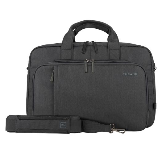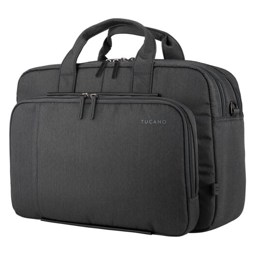 Tucano Flash 15 бізнес-сумка з нової колекції 2022 року. Призначена для перенесення ноутбука з діагоналлю екрану 15,6/16 дюймів або MacBook Pro 16 дюймів. Виготовлена з переробленого пластику, а декор зовнішніх елементів з еко шкіри. Сумка призначена в основному для роботи і складається з трьох відділень, що закриваються блискавками, а також добре організованими кишенями.