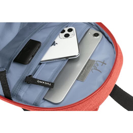 Невеликий спортивний рюкзак Tucano Ted 11 з переробленого пластику (пет пляшки). Оснащений внутрішньою кишенею для планшета і передньою кишенею для аксесуарів. Ззаду є ремінець для фіксації рюкзака на телескопічною ручці валізи.