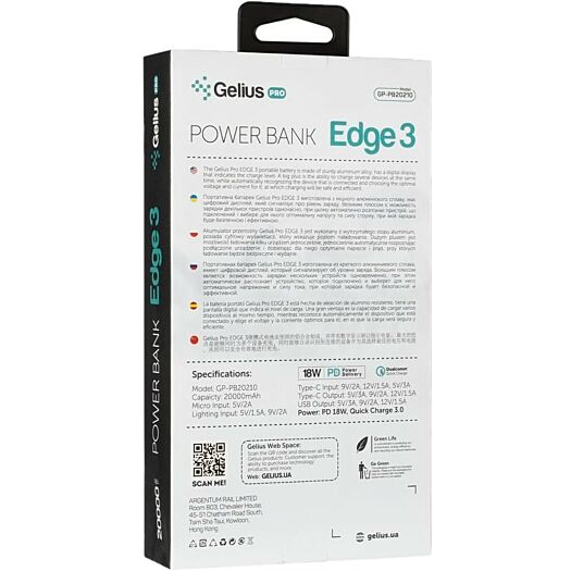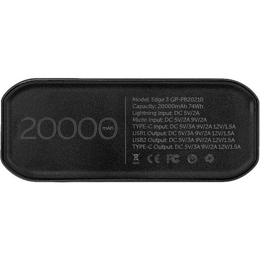 Edge 3 має ємність 20000 мАг. У розпорядженні будь-яких ваших портативних пристроїв: два USB і один Type-C роз'єм. Будь-який сучасний пристрій можна зарядити за допомогою цього повербанка. Живити саму батарею можна за допомогою кабелю type-c, який йде в комплекті, так само є MicroUSB і Lighting роз'єми.