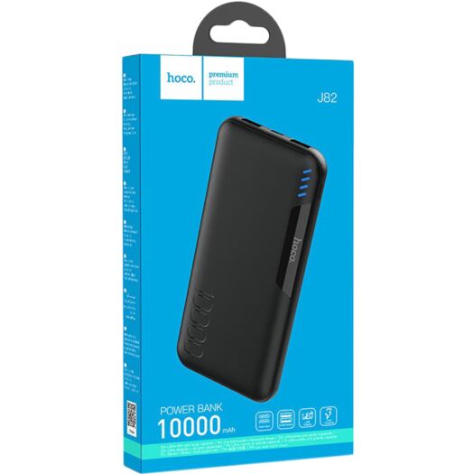 Ємність Hoco J82 становить 10000mAh. LED індикатори допоможуть визначити рівень заряду повербанка та активуються за допомогою кнопки, розташованої на бічній грані. Практична реалізація пристрою доповнена оригінальними дизайнерськими акцентами, представленими глянсовою накладкою із зображенням логотипу та незвичайно реалізованими LED індикаторами.