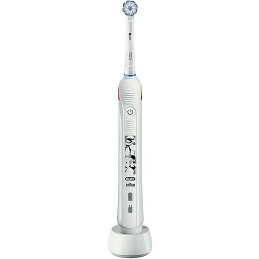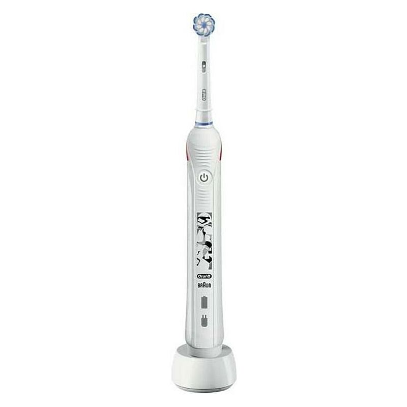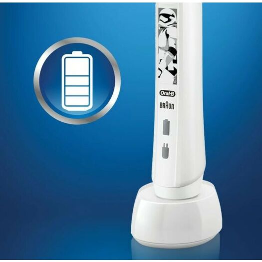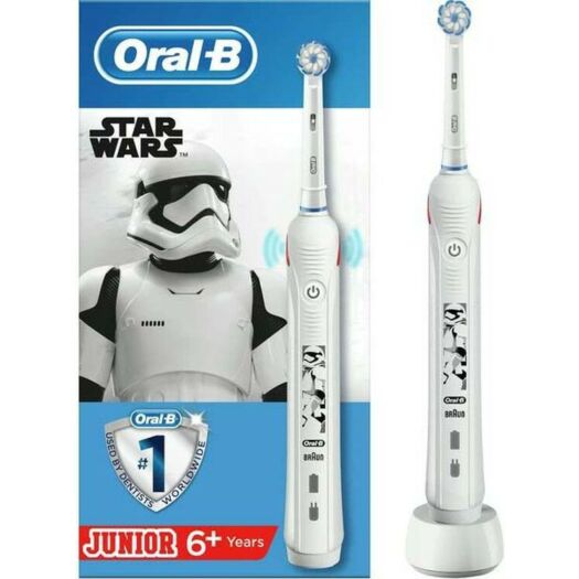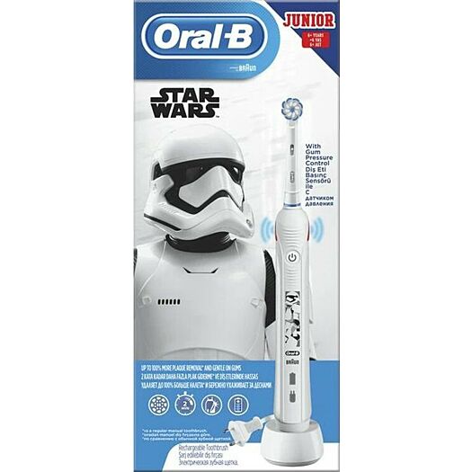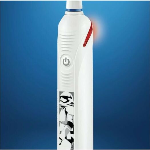Електрична зубна щітка Oral-B Junior «Зоряні війни» для дітей віком від 6 років розроблена спільно зі стоматологами для чудового очищення ротової порожнини. Зубна щітка має датчик тиску на ясна: при надмірному натисканні на щітку індикатор датчика тиску починає блимати червоним світлом, і швидкість чищення знижується, що забезпечує захист ніжних дитячих ясен. Кругла голівка щітки оснащена екстрам'якими щетинками. Безкоштовний додаток Disney Magic Timer від Oral-B зробить чищення зубів ще більш захоплюючим. З ним 90% дітей чистять зуби довше. Ця зубна щітка допоможе вашим дітям навчитися самостійно чистити зуби та сформувати здорові звички щодо догляду за порожниною рота на все життя.